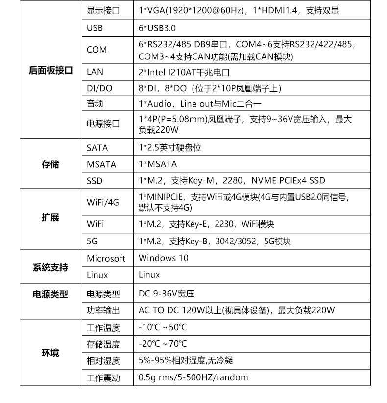 ● 6*RS232/485 DB9 串口,COM4~6支持RS422,COM3~4支持CAN(需加载CAN模块)